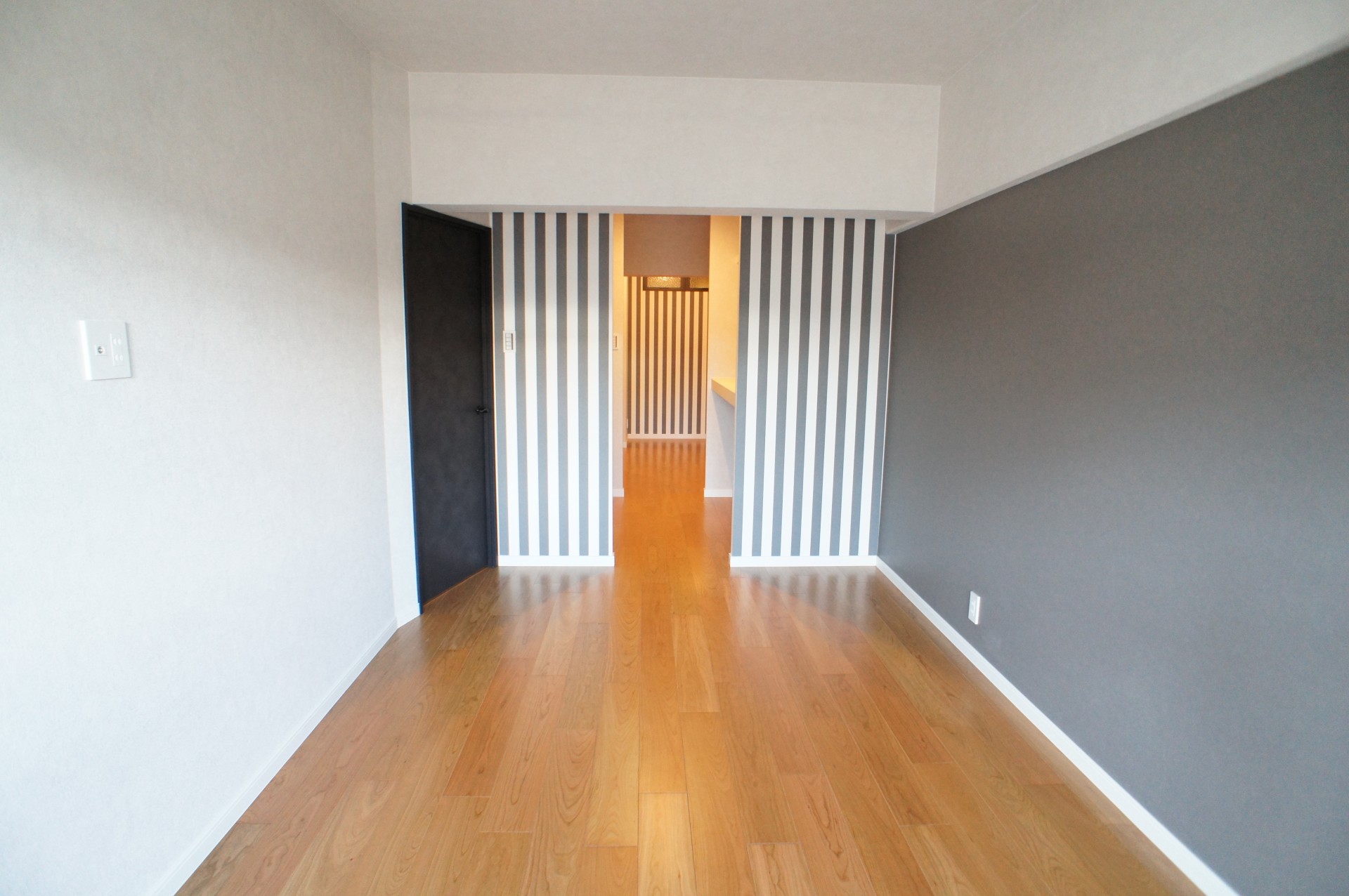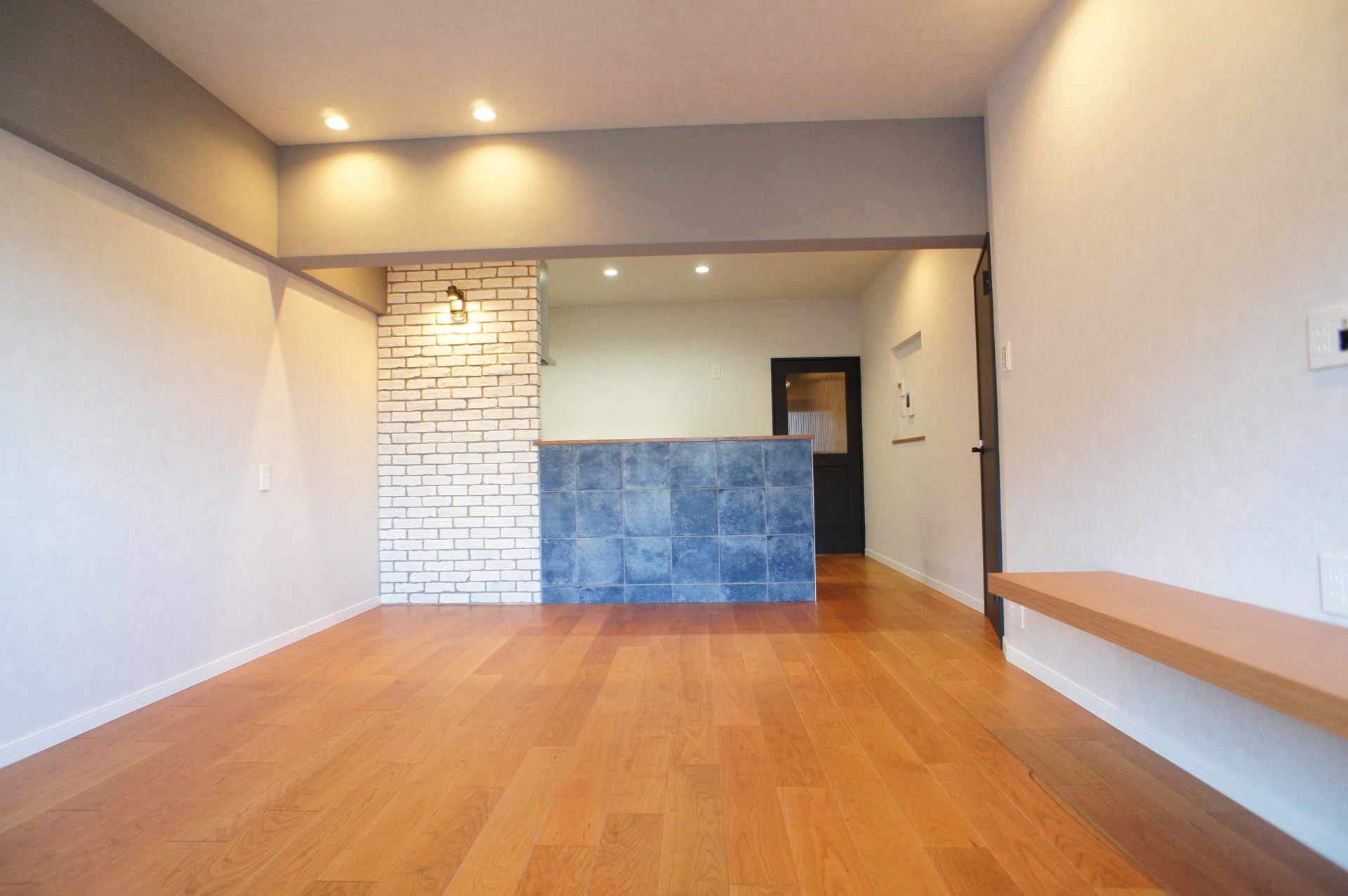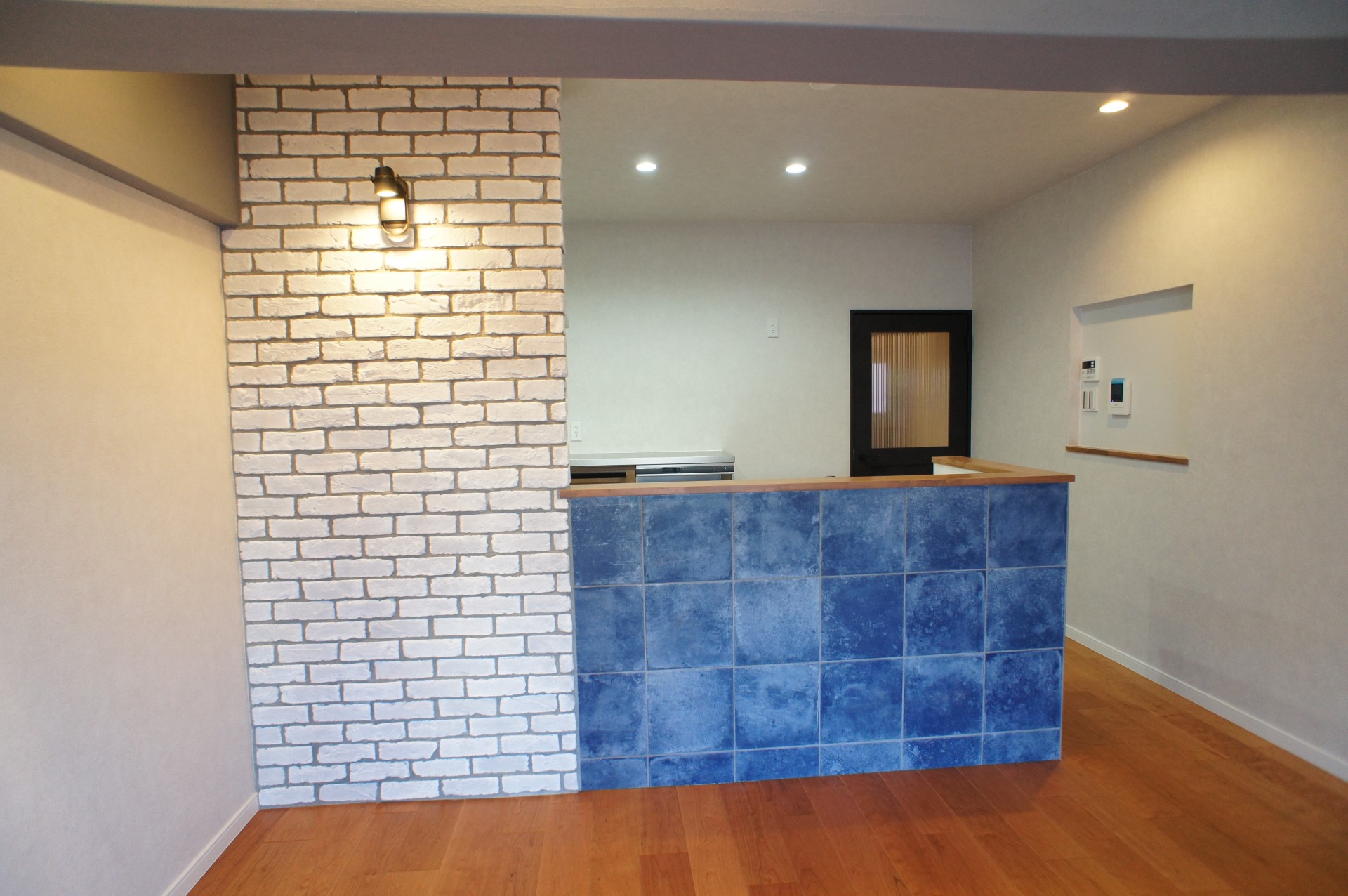 玄関を開けるとリビングまで廊下壁に貼られたヴィンテージレンガが重厚なブルックリンNYスタイルを感じさせます。