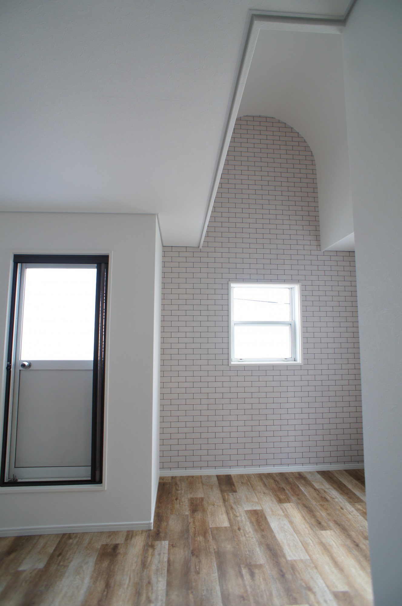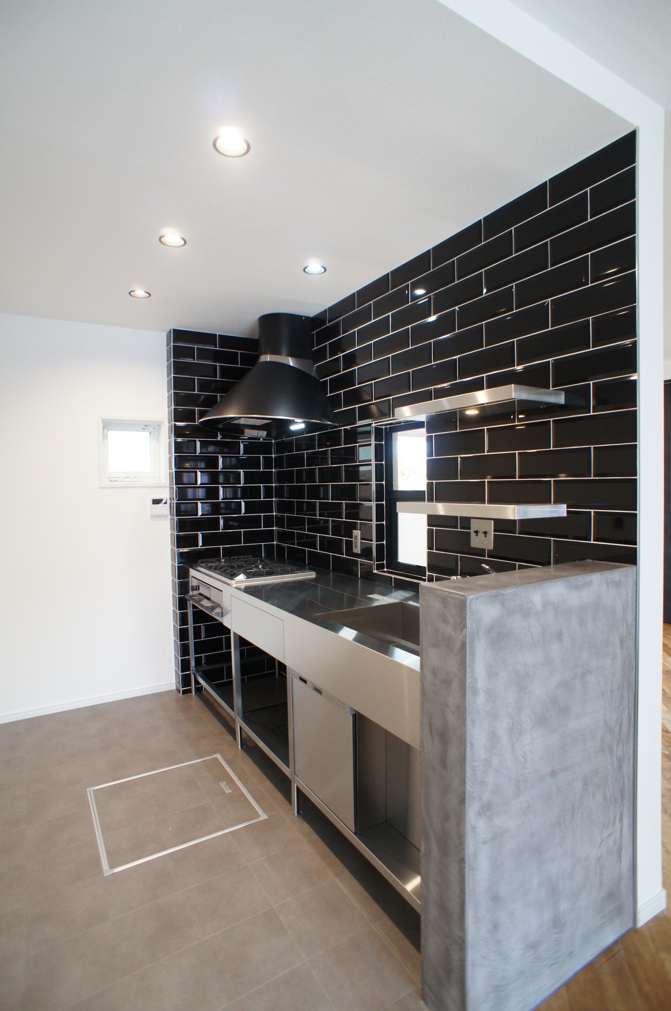 キッチンとダイニングの間の壁を取り除くことが構造上出来ないので、筋交いの間の部分的に取れる範囲で室内窓を設置しダイニング側の様子も伺えるようにしました。