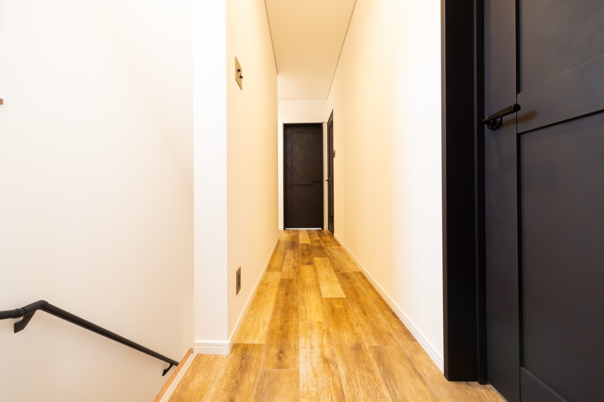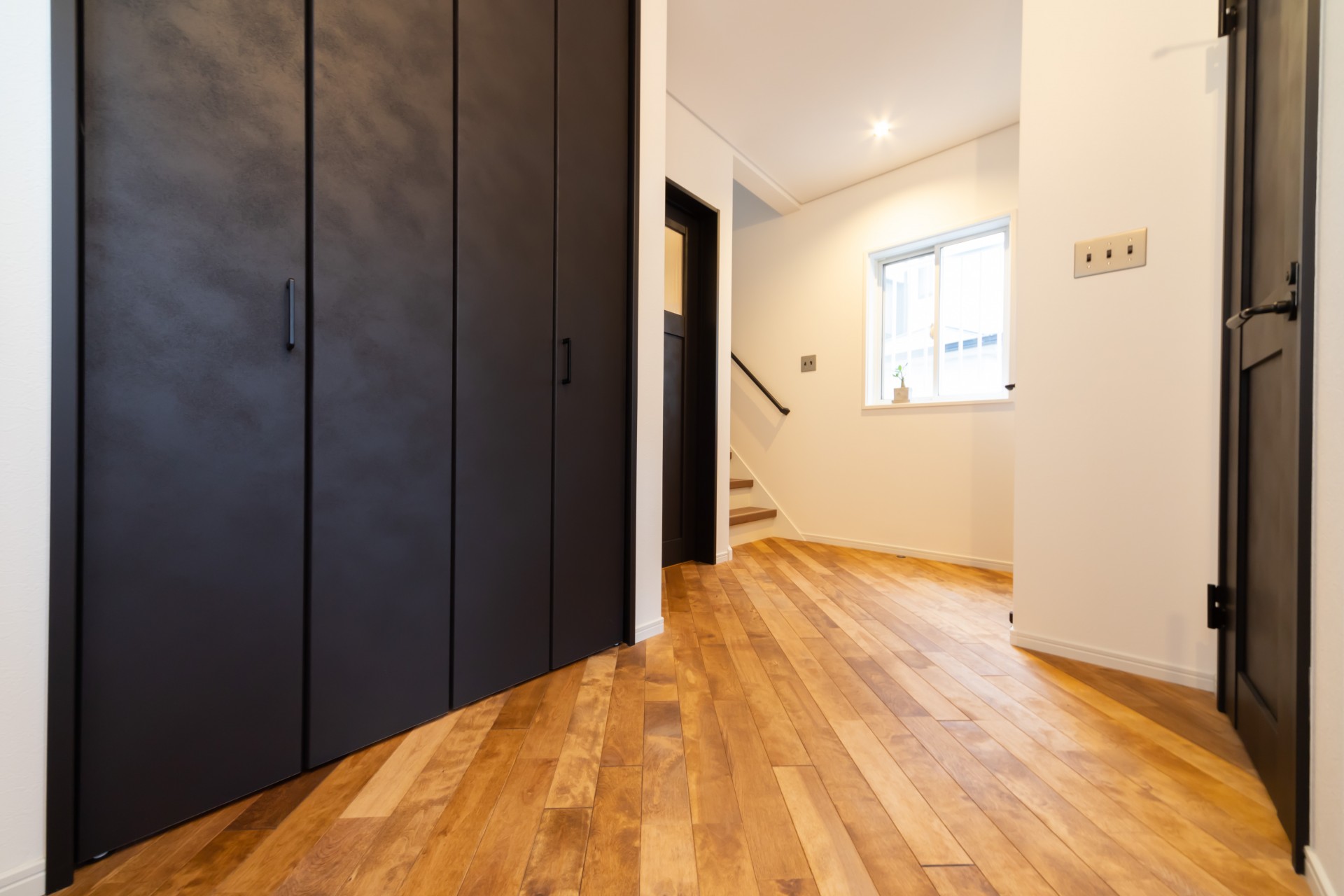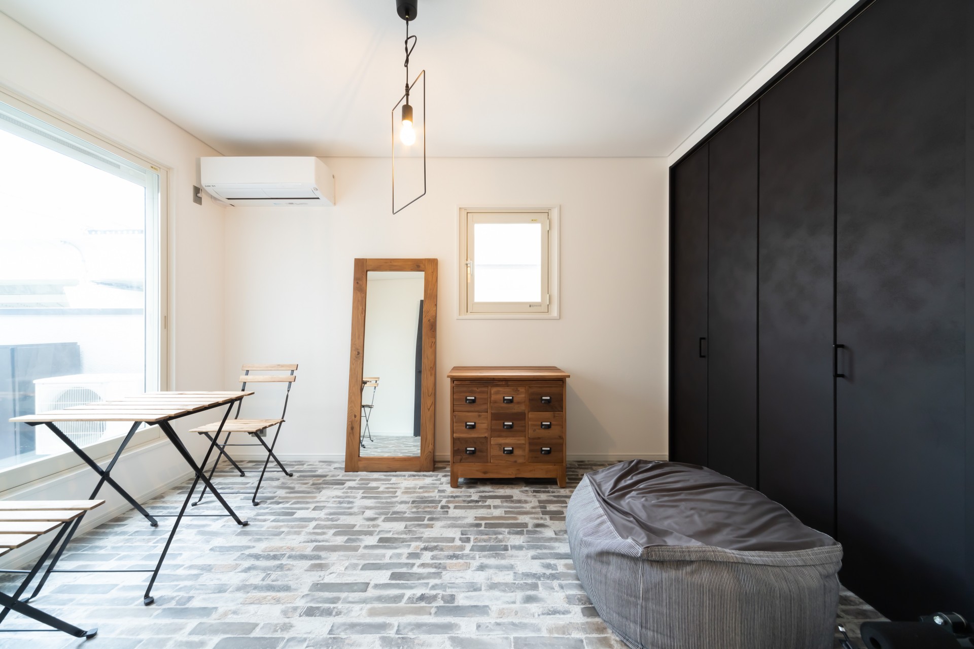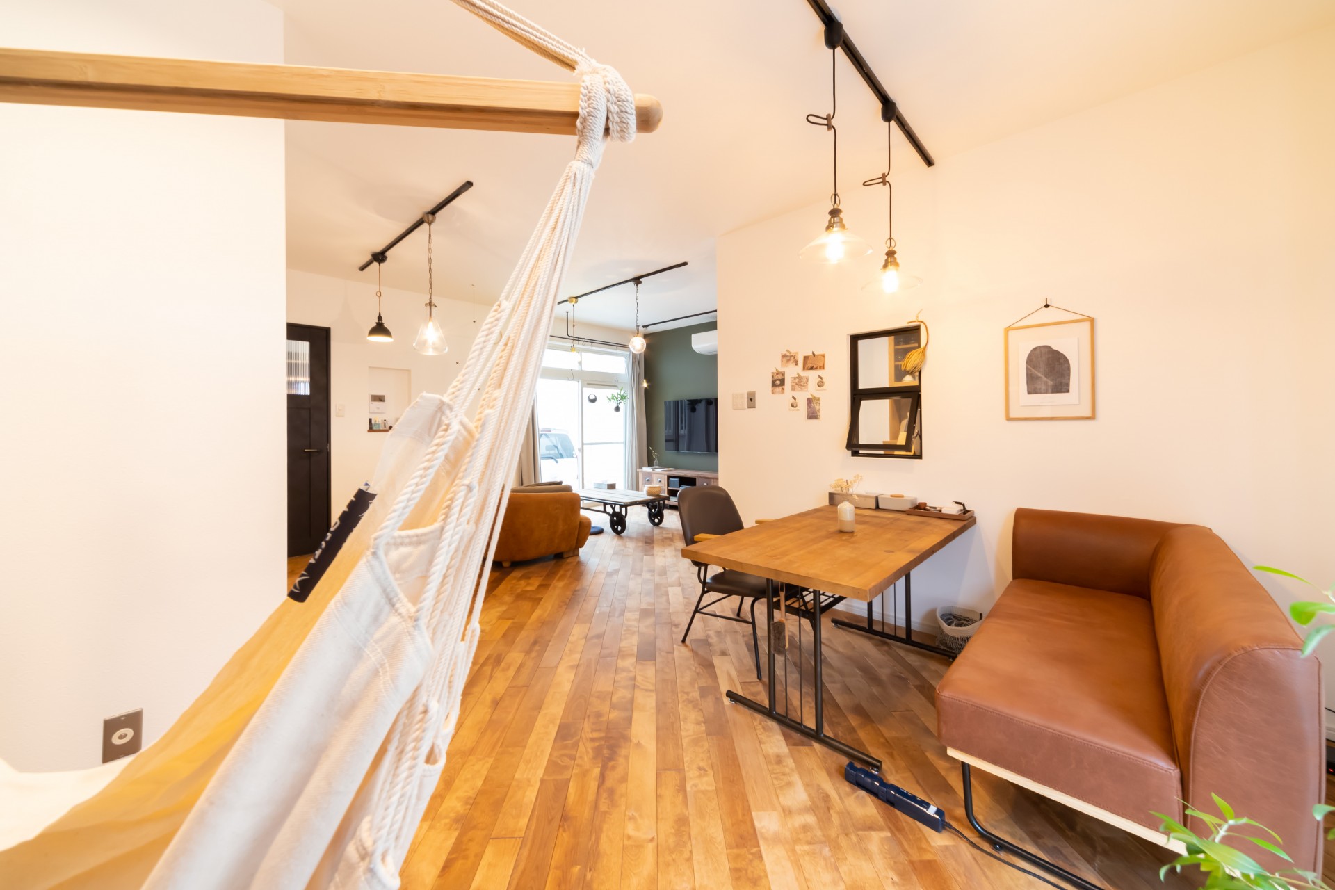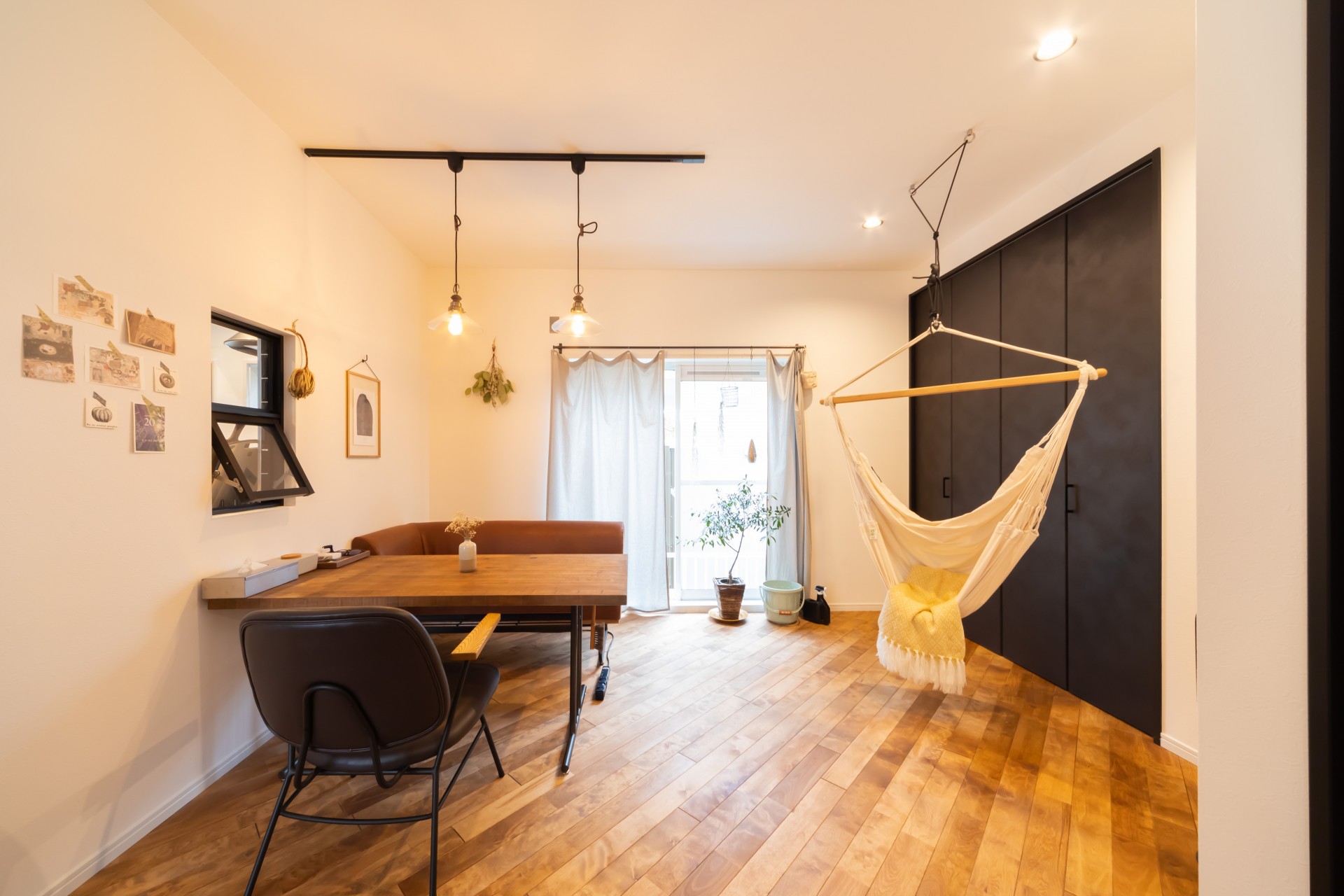 無垢のフローリングを斜め張りにして広がりが出したり、ハンギングプランターを吊るためのアイアンバーを付けたりはご主人様のご要望です。