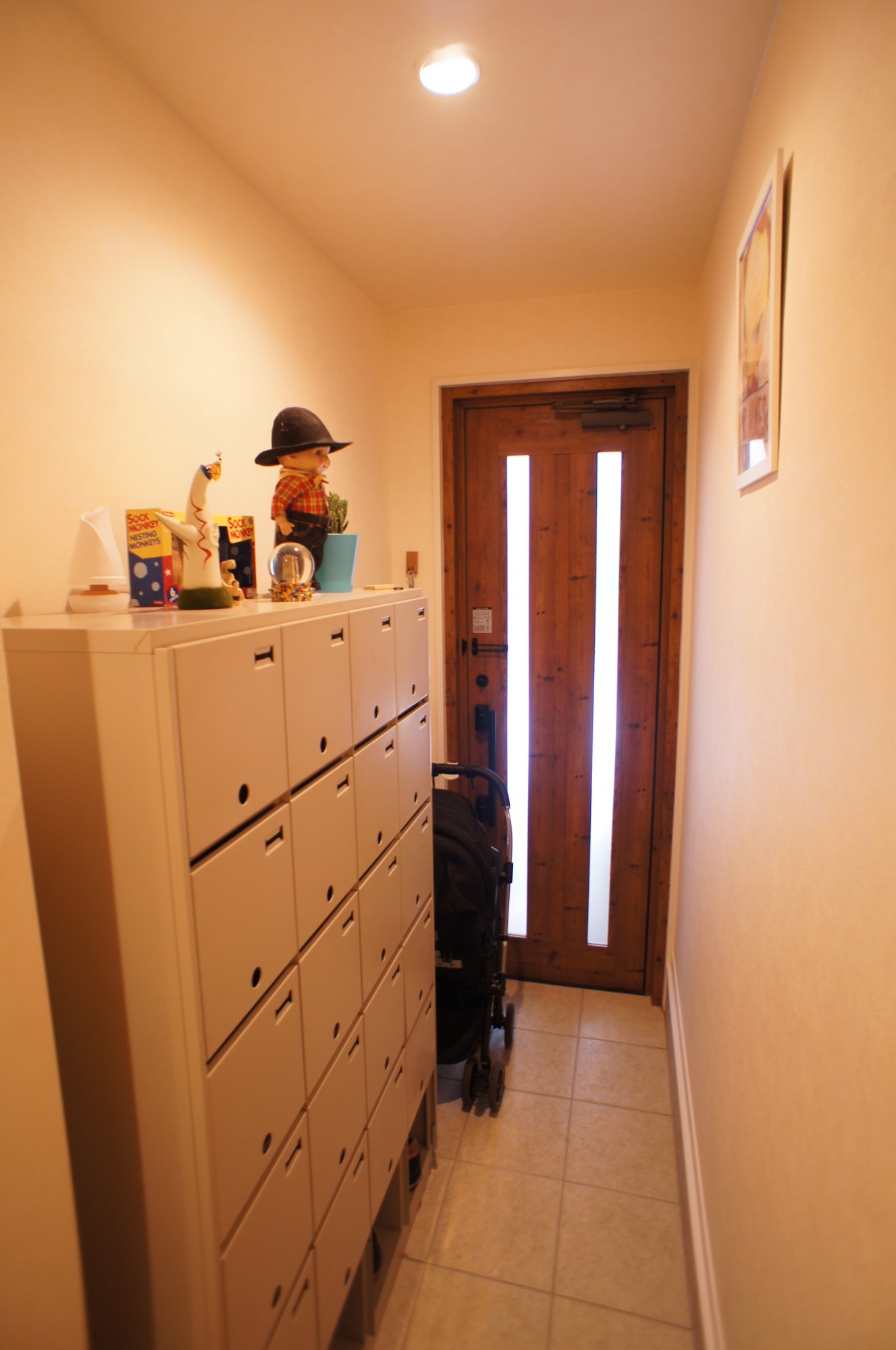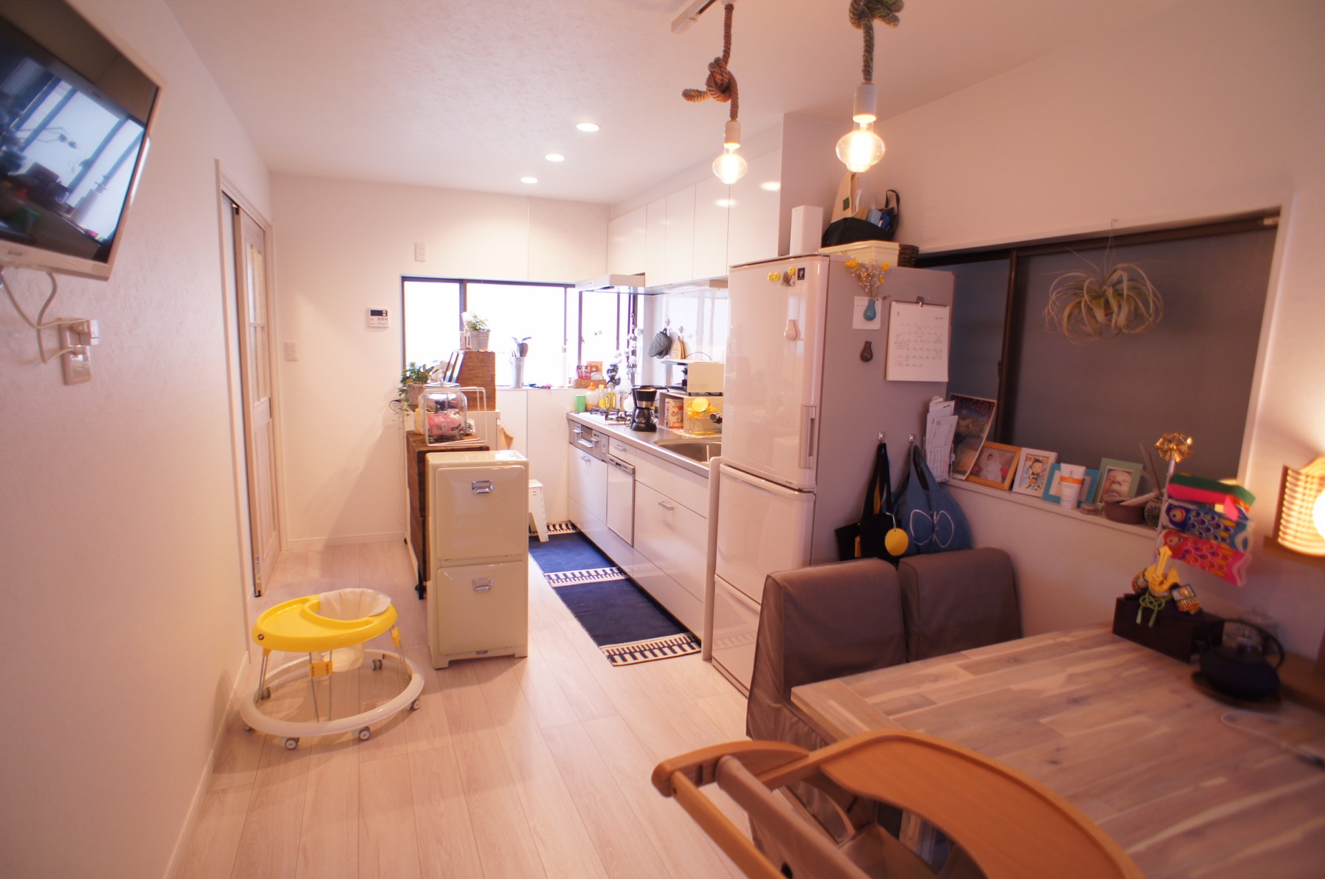 細長い敷地で3面が建物に囲まれてる為昼間でも薄暗かったので中央の部屋を奥の部屋と一つにしたり、間の壁を少なくしたり、内装は白を基調にし、光の反射で明るくするようにしました。