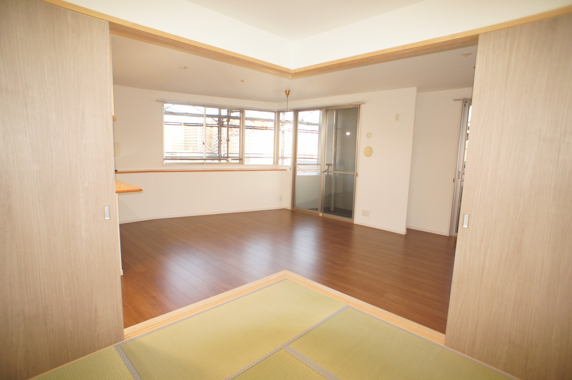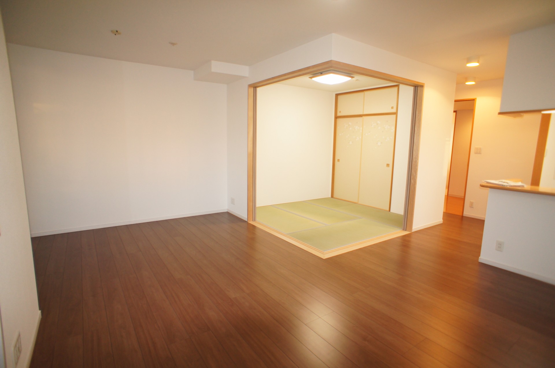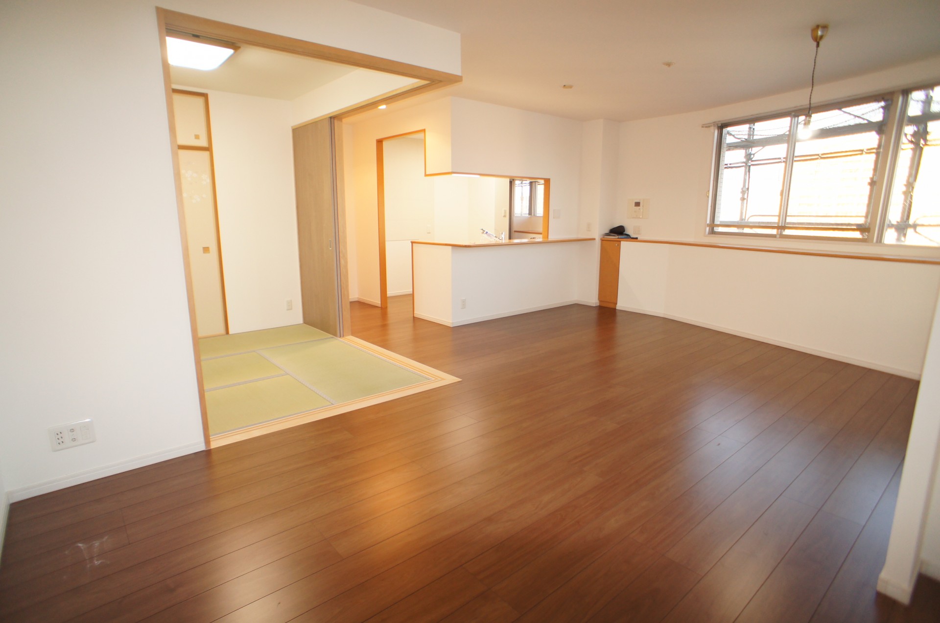 4LDKの間取りのお部屋でしたが、リビングをもっと有効に広く使えるようにリビング横の洋室をリビングに取り込み和室も開放できるように壁を取っ払い扉を新しくし最大25畳になる広いリビングは対面キッチンからリビング全体を見渡せるようになり使いやすくなりました。