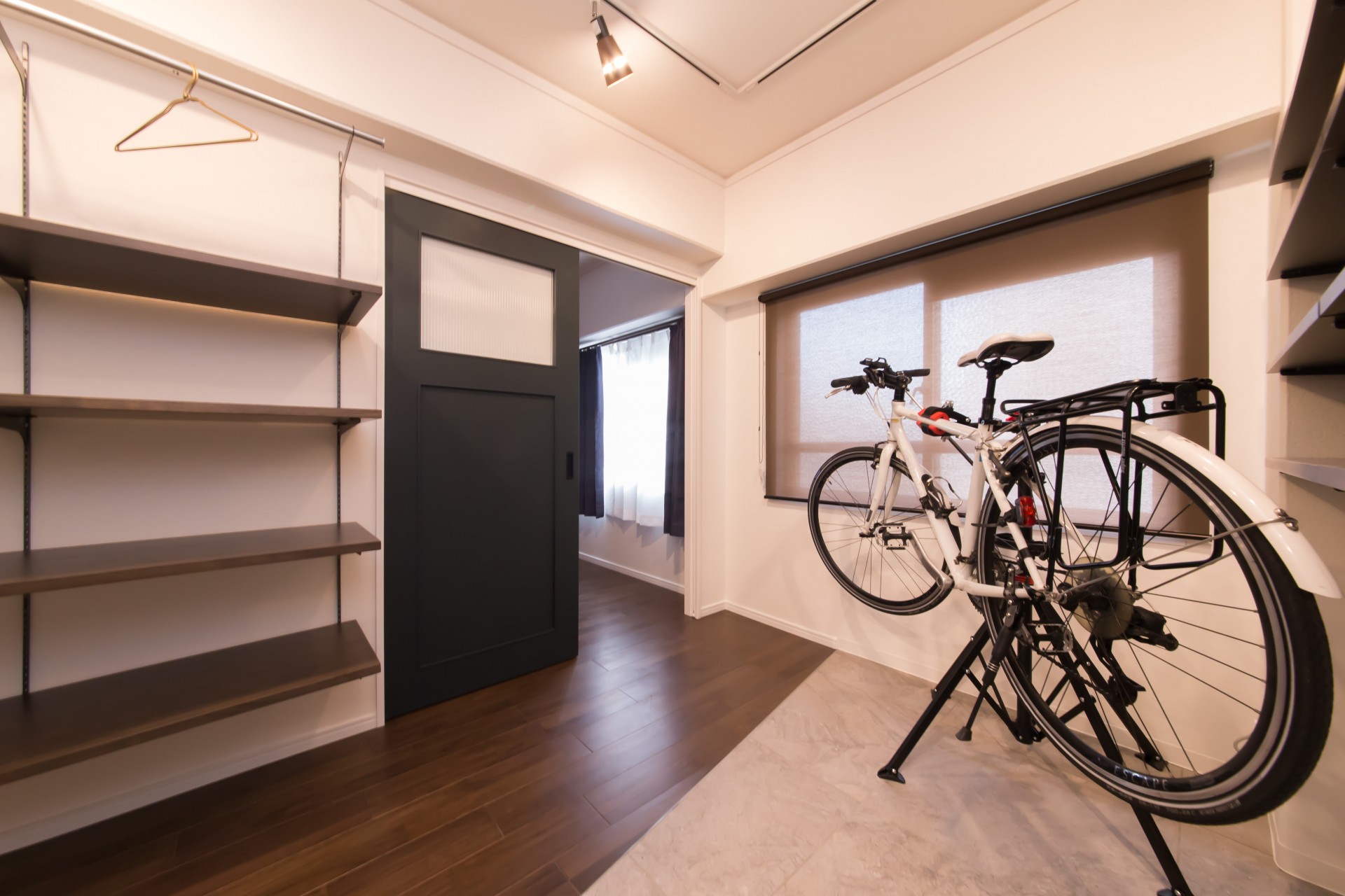 魅せる収納棚にお気に入りの靴や洋服を飾りながら片付けられ広い土間にはアウトドアグッズや自転車もたっぷり収納できます。